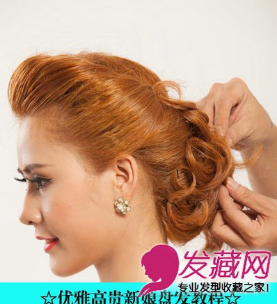step 3:将头发盘成优雅的低发髻,用发尾弄成卷曲的形状,搭配出精美的盘发。