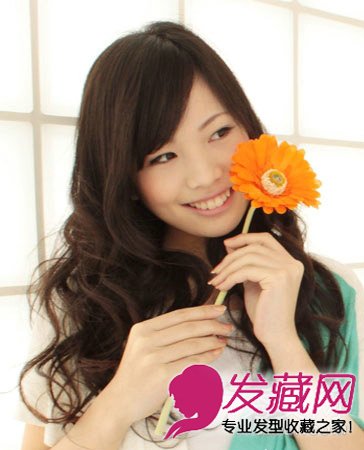 斜分的刘海,露出好看的眉毛,头发从脸颊开始大波浪向下卷,在发尾部分弄散,黑色使真个造型非常原始和清纯。也很好的修饰了脸型哦。
