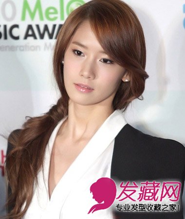 极具时尚气息,长发在侧边扎慵懒的发辫,烫卷的斜