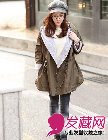 中长的卷发染成棕色很有时尚感,褐色宽松风衣的灰色外翻与帽子颜色相近,整个造型在色调搭配上很好。