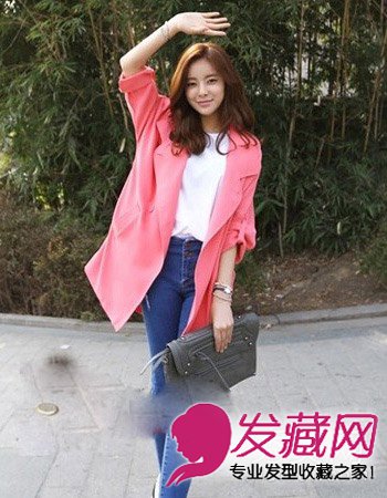 斜刘海低扎发+粉色翻领外套 长卷发配春装时尚轻熟(6)