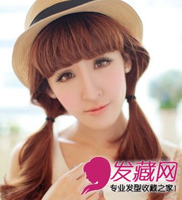 小萝莉,把卷发扎两个松散的马尾辫更显嫩,蓬蓬的棕色齐刘海凸显少女可爱气质娃娃脸衬衫,编织帽夏日清新感十足。