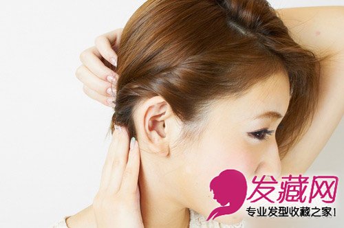 step2:将右侧的头发一路向内扭转后固定在脑后。