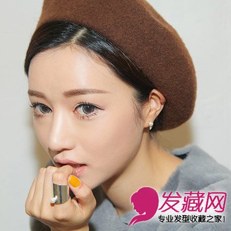 这款发型将刘海一九分梳理整齐,头发全部塞进咖啡色贝雷帽中,简简单单显得帅气又时尚。