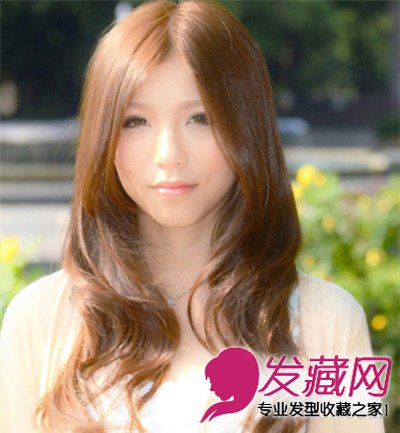 中分的头发遮住两边眼角,让眼神增添迷离的感觉,脖子以下的头发大波浪卷曲,以及浅棕色染发,独具优雅淑女气质。