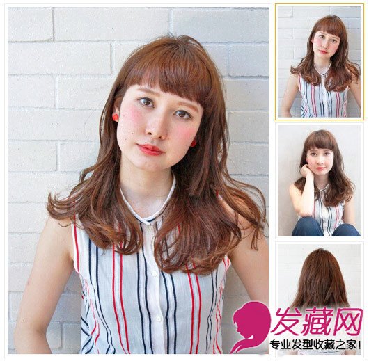 发型点评:整齐的齐刘海露出眉毛的造型可爱又俏皮,棕黄色长卷发随意的摆动在肩头,甜美浪漫。