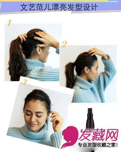 在扎高马尾的时候,只需要用手指完成就可以了。绑好马尾后,在手指上涂抹一些蓬松美发产品,然后将手指插入头顶发根,进行挑松,打造出立体的头顶,然后再戴上邻家感觉的头箍就可以了。
