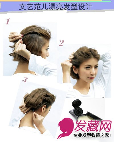 首先,将头顶左右两侧的头发向后脑中央编织出麻花辫子,再将耳朵上方的头发混编在麻花辫里面,注意,编织只需要随意就好。然后将后面的头发往内收在发根里,涂一些定型产品就完成了。