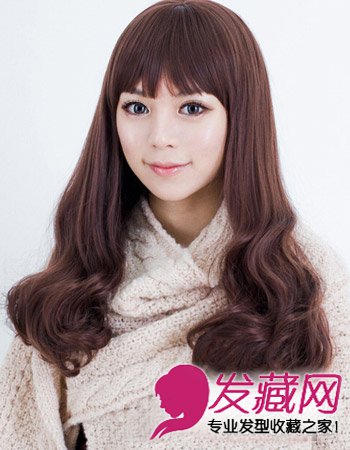 简单的齐刘海搭配蓬松的韩式长卷发,再加上棕色的染发,打造一款时尚减龄的气质