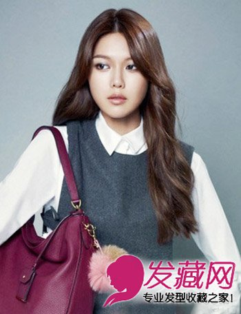 甜美感十足的韩式卷发,栗棕色的独特发色,更能在原有发型的基础上增加纯美气息,长长的的波浪发型中分的瘦脸刘海也是一大看点,迷人的外翻