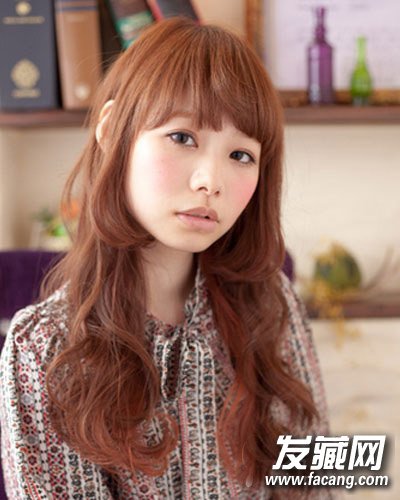 巧妙利用齐刘海制作小脸效果,蓬松的大卷造型打造出甜美浪漫的气质,再配以时尚的红棕色发色,很显白皙的皮肤,给人清新的感觉。