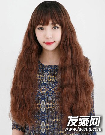 ,加上蓬松的圆脸长卷发,再搭配厚重的齐刘海修饰,展现一款时尚气质的卷烫