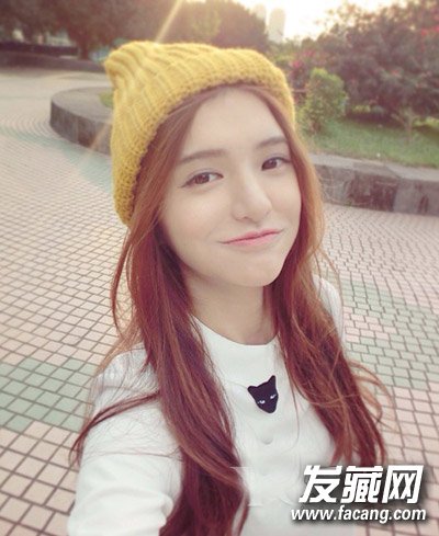 不是完全的长直发,微卷的长发更加时尚甜美,棕色系色头发颜色衬托肤色同时更修颜,带上帽子更是可爱俏皮。