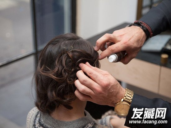 Step 2:放下两侧的头发,将它们做成复古卷的模样。把头发分成几缕,用U型夹将每一缕的尾部以画圈的方式卷出弧度并固定在后侧。可以喷上一些定型喷雾,加速发卷的形成。柔软的发丝,会让你看上去更浪漫优雅。