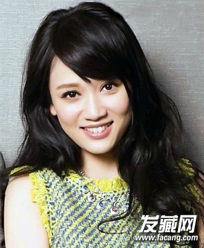 黑色卷发知性而美好,斜刘海修饰脸型,凸显出纯真动人的笑脸。