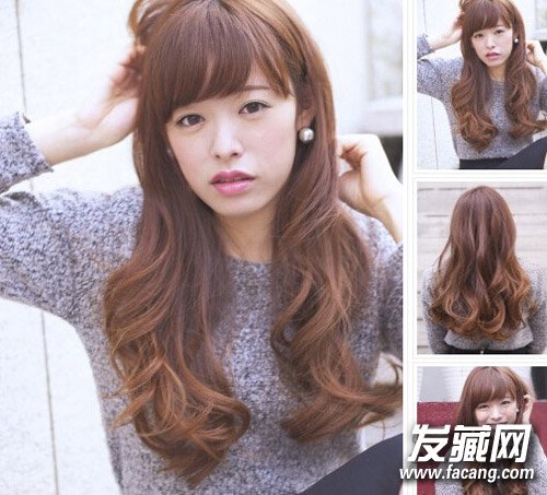 发型点评:厚重的刘海别致个性,凸显出一双灵气十足的眼睛。棕色长卷发饱满厚重,大波浪