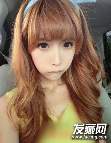 齐刘海遮住额头同时也凸显了女生的大眼睛和小巧的脸蛋,中间的长发开始做一个微微的卷发处理,再搭配上一个比较亮色的发色,不但看起来比较时尚,而且看起来非常地甜美可爱。