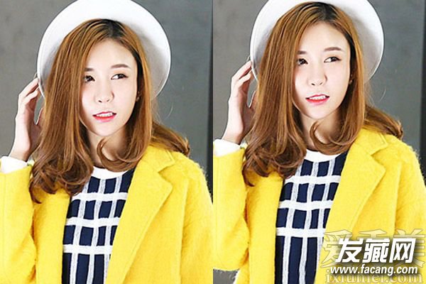 以明亮温暖的橘黄色染发颜色为主,来衬托出女生肤色的白皙红润感,而搭配偏分的长刘海发型设计与内扣形式的齐肩梨花头同样优雅吸睛。