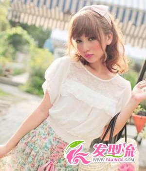 韩式卷发扎发 依然是带有韩风的一款卷发发型,利用蝴蝶结发带,把卷发束发,让原本单调乏味的发型顿显生机和时尚感,把小女生的甜美可爱演绎到了极致。两侧余留几缕长发做修饰,丰富了造型感。加上瘦脸的刘海,打造甜美小脸美女。