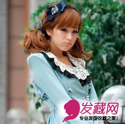 将卷发在耳鬓处扎成两个马尾透露着丝丝淘气的色彩哟,像洋娃娃一样甜美可爱,发饰也是不可缺少的元素。