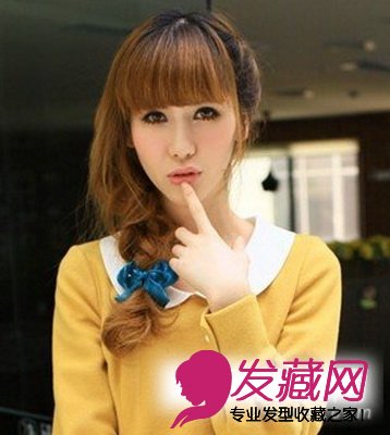 厚重的齐刘海让双眼突显明亮,蓬松的卷发编成一束麻花辫,斜搭在胸前,营造出性感迷人的气质。发梢利用蓝色的发带点缀,让造型更显可爱俏皮。这款邻家女孩般的