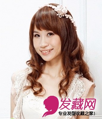 挑染的卷发更显时尚感,长卷发随性的披散在肩上,优雅无比。刘海的偏分,露出光洁的额头,拉长了整个脸型,发带的装饰,更显甜美风,一抹浅浅的笑容让无数男生为她倾心。