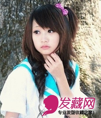这款中长卷发有着浓浓的学院风气,发尾制造出井然有序的螺旋卷卷,在头顶的一侧扎出一个小马尾,别上紫色蝴蝶结发夹,俏皮可爱,斜分的刘海衬托出一双清澈的双眸,释放着纯纯的气息,搭配一款学生装,打造出了一个经典的学院风女生形象。