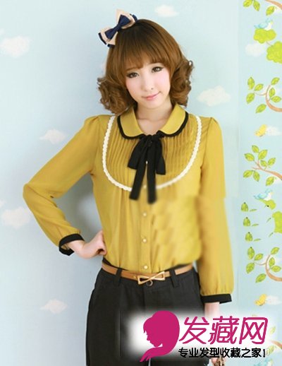 齐刘海的短卷发,不仅显可爱萝莉,而又有娇小女人气质,搭配两种色调组合的蝴蝶结发箍十分的抢眼惹人爱呢!