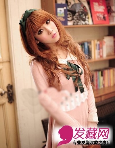 奶茶系女孩的长卷发,搭配齐刘海粉嫩可爱,而且更有萝莉女孩的气息,再搭配深色系的发带更耀眼夺人。