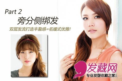 不同一般的侧绑发制式的绑起,首先将2/3头发于侧边固定起来,再将剩下的1/3秀发顺着向旁边拨,用双层发流制造丰盈律动感。