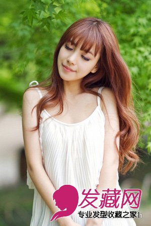 小编点评:甜美的长卷发,红棕色的发色,既增加了时尚感,也衬托出女生白里透红的好肤色,斜刘海很好的修颜,也让浪漫指数提升。