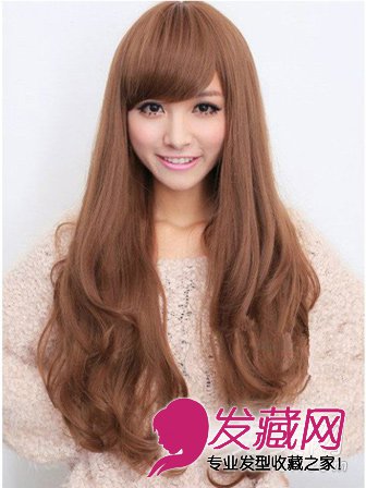 有点蓬松的斜刘海长卷发,颜色为深棕色,有了这样的一款发型,让你随时变为时尚女生