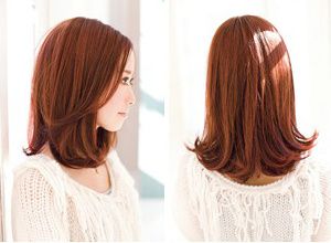 正面:及肩长度的中长发,利用卷发 棒烫出微微的“C”型轮廓,再于发尾部做出向内的卷度,包裹着脸部,达到小脸的效果。中分的刘海 有效地打破发型原有的甜美感,增加知性的感觉。还可以凸显脸部精致的五官。