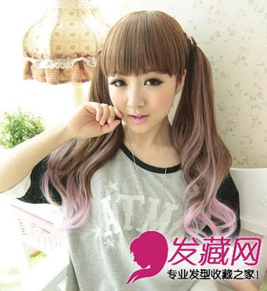 ,双马尾与齐刘海将卷发的可爱点大大升级,亚麻色染发本身就有着非主流的活力感,发尾的粉色挑染发,个性潮女值得一试。