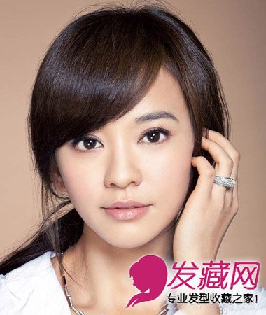 斜刘海披肩发发型,发丝修剪出利落的层次感更加清新自然,搭配斜刘海,很适合圆脸MM的修颜发型。
