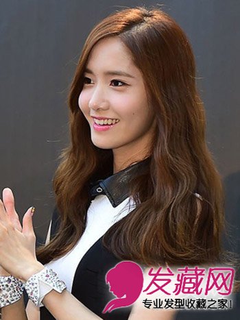 允儿的这款韩式波纹烫发也备受青睐,长斜刘海遮住小半边脸清新瘦脸,卷曲的发丝飘逸轻盈,是轻熟女们必学的约会发型。