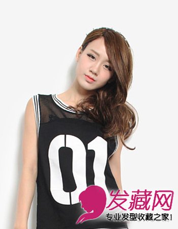 偏分式的侧边中长卷发发型,丰盈而略显蓬松的卷发造型配合偏分的设计很显女生的优雅气质感,很适合OL一族的一款造型,而运动式的上衣更显女性的活力感。