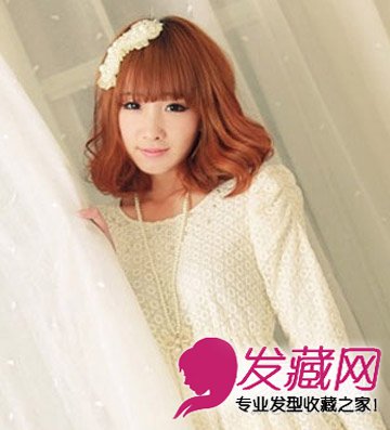是一款很百搭的修颜发型,齐刘海梨花烫发型蓬松飘逸,搭配发饰点缀,唯美清新。
