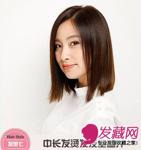 发型点评:这款中长发简约却不单调,侧分长刘海修饰出V脸型,垂直感烫发个性十足。
