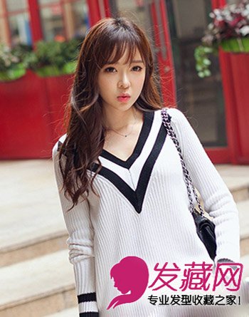 随意披散的长卷发,气质唯美,搭配棕色的染发,充满时尚气息,空气刘海的设计,不仅完美修颜,而且凸显出甜美青春甜美的一面。