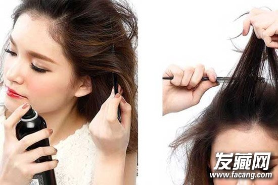 2.运用尖尾梳尖头处,挑起来喷造型喷雾。