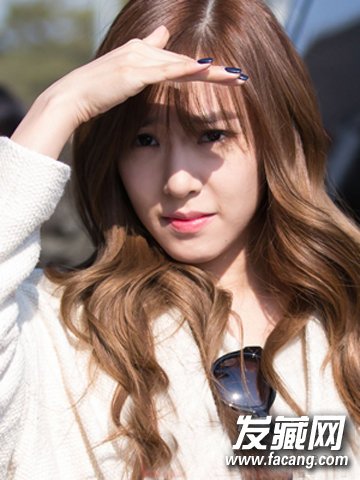靓丽清新的齐刘海长卷发也是一款很百搭脸型的修颜发型,深棕色染发的发丝蓬松浓密,齐刘海披肩发淑女范儿十足。