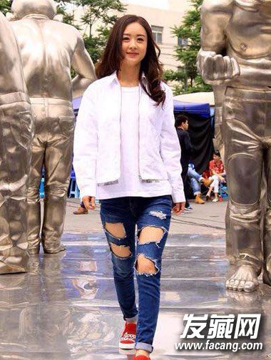 这样的卷发发型很显时尚范儿,大波浪款发配上破洞牛仔裤,潮感十足。