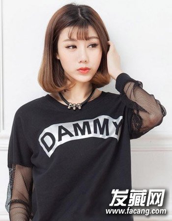 简单的空气感刘海造型设计清新灵动感十足,再配合这种时尚的深棕色染发设计与简单的中短发内扣波波头卷发造型同样很显清新学院风。