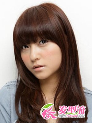 这款圆脸发型设计的打造重点就在于这款覆盖式刘海的修剪方式啦,从发顶处开始直至脸颊的位置都被好看的刘海覆盖住了,健康的秀发呈现出一种自然的蓬松效果!长