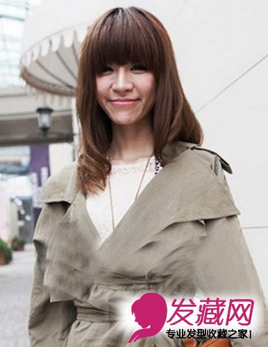 厚厚的长刘海将整个额头全部遮住,脸旁厚实的发量瘦脸效果特别明显。