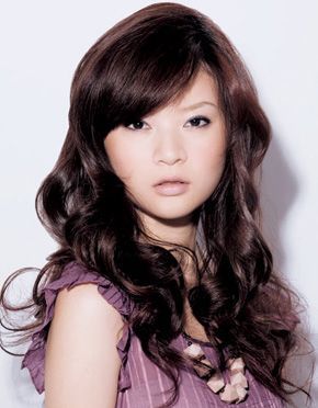 发型重点:利用中分和较长前发修饰较宽颧骨,前发量要足,头顶烫大卷,下方轮廓利用中卷弹性烫制造外翘发尾,可中和过瘦脸 型,感觉比较有精神。