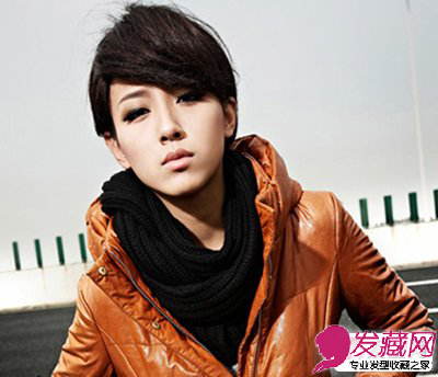带点中性的短发,张扬个性,梳向一侧的斜刘海打造出蓬松感拉长了脸型,黑色的头发自然清新,搭配棕色棉衣黑色的围脖,非常帅气的一款造型。