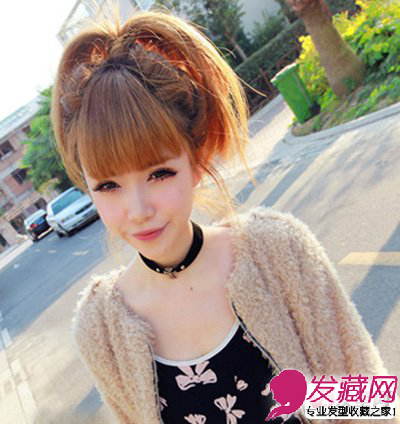 顺滑的齐刘海衬托的精致的小脸尤为小巧迷人,高扎的马尾自然的分成两半垂在耳边,显得特别活泼可爱,棕黄色的染发更增时尚元素。