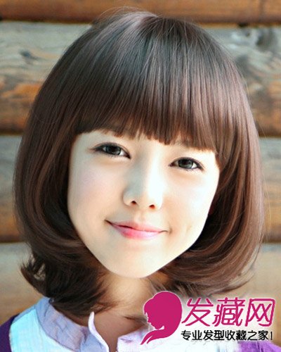 齐刘海是重点,将略窄的额头衬的宽一些。发尾处可以用蓬松的凌乱发丝来增强略显窄的下巴,让整个